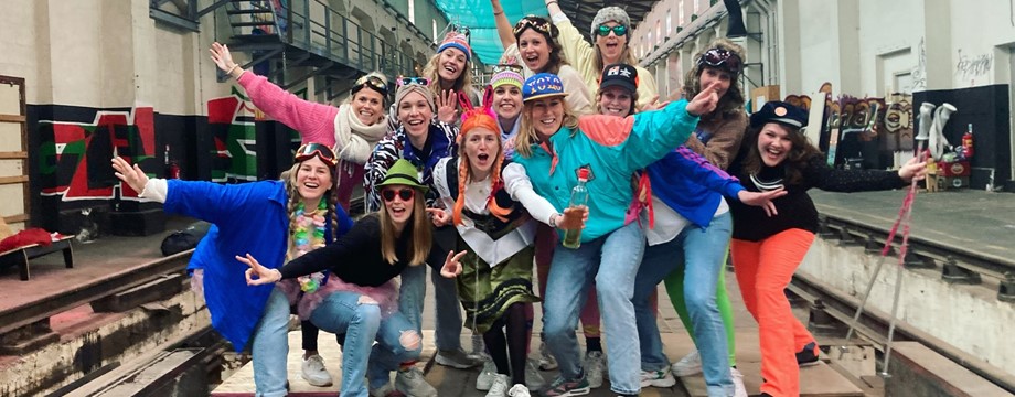 Middels allerlei attributen zoals ballonnen, serpentines, boa's, pruiken, feestbrillen etc. is het plaatje compleet!